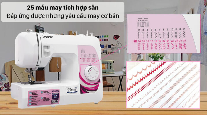 Máy may Brother GS2500 được tích hợp 25 mẫu may giúp người dùng thỏa sức sáng tạo trên từng mũi may. Từ may thẳng đến may zigzag, may cơ bản đến trang trí, giả vắt sổ…